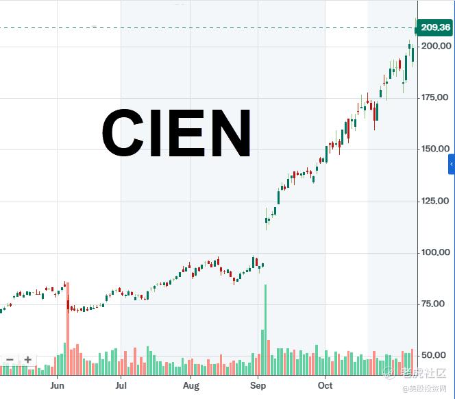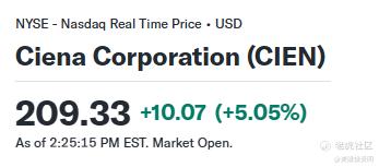 今日,市场再次印证了这一逻辑:光通信板块集体强势上涨,其中光通信解决方案龙头 Ciena ( $Ciena科技(CIEN)$ ) 大涨超5%,股价站上209.33美元。