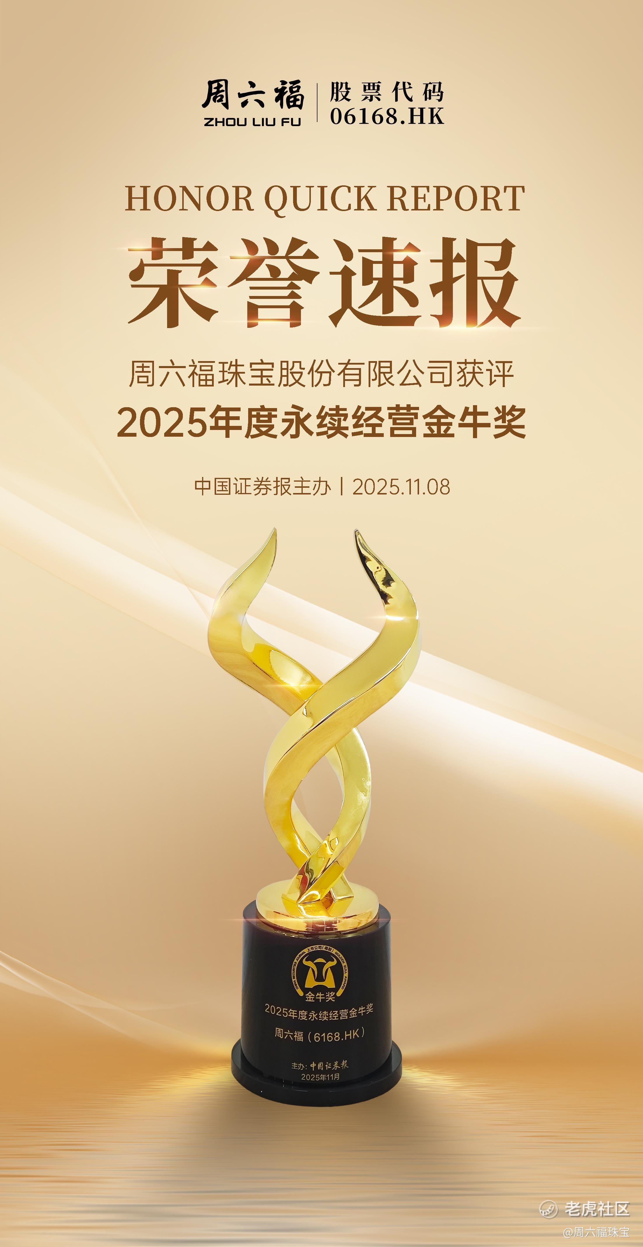 11月8日,由中国证券报主办的2025厦门产业发展大会暨金圆集团杯·上市公司(港股)金牛奖颁奖典礼召开,周六福(6168.HK)凭借稳健的经营质效、持续的价值创造能力及坚定的发展韧性,荣获“2025年度永续经营金牛奖”。