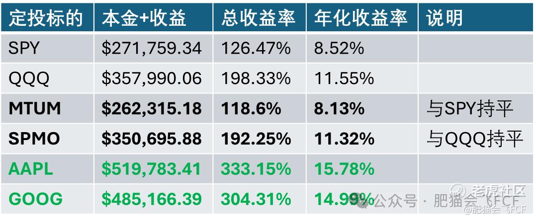 更重要的是,在很多时候,SPMO 和 MTUM 的回报率并没有显著超越 SPY 或 QQQ。 此外,五年/十年期的累计回报率往往高度依赖于你选择的起始时间点,稍有不同可能结论就会完全相反。 因此,更有意义的比较方式并不是单一时间段的累计收益,而是长期定投(DCA)的平均收益率。