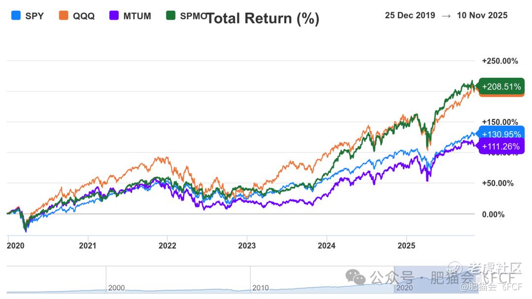 ETF中有两只代表性产品:MTUM $MSCI美国动量因素ETF-iShares Edge(MTUM)$ 和SPMO $Invesco S&P 500 Momentum ETF(SPMO)$ ,它们在2020-2021年因大涨超过SPY而一度爆火。