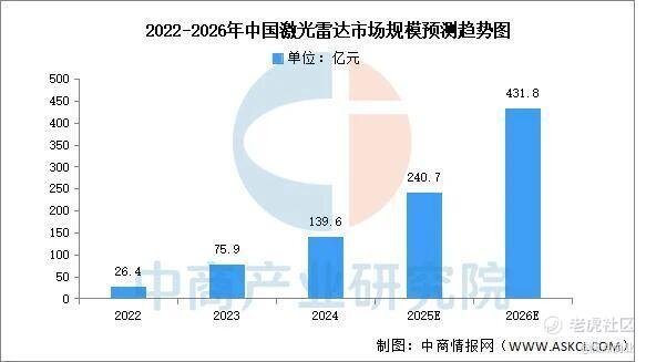 中商产业研究院发布的《2025—2030年中国激光雷达行业市场前景预测及未来发展趋势报告》显示,2023年中国激光雷达市场规模约为75.9亿元,2024年约为139.6亿元。其分析师预测,2025年中国激光雷达市场规模将达240.7亿元,2026年将达431.8亿元。