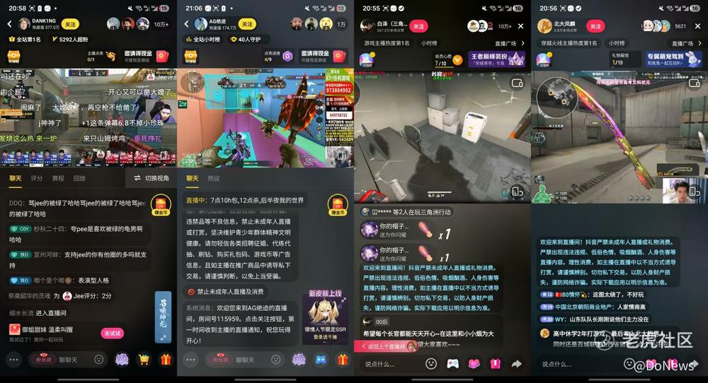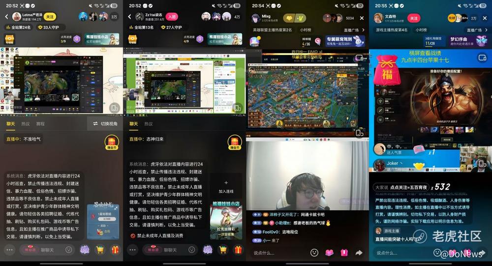 与此同时,在虎牙,MLXG等主播空出的位置迅速被如楚河、姿态等老牌主播,和三角洲顶流杨齐家等新主播顶替。下面图片中是12日晚间,来自虎牙(左一、左二)和抖音(右一、右二)的英雄联盟头部主播的实时直播数据对比。可以看到,虎牙的主播热度要更高。