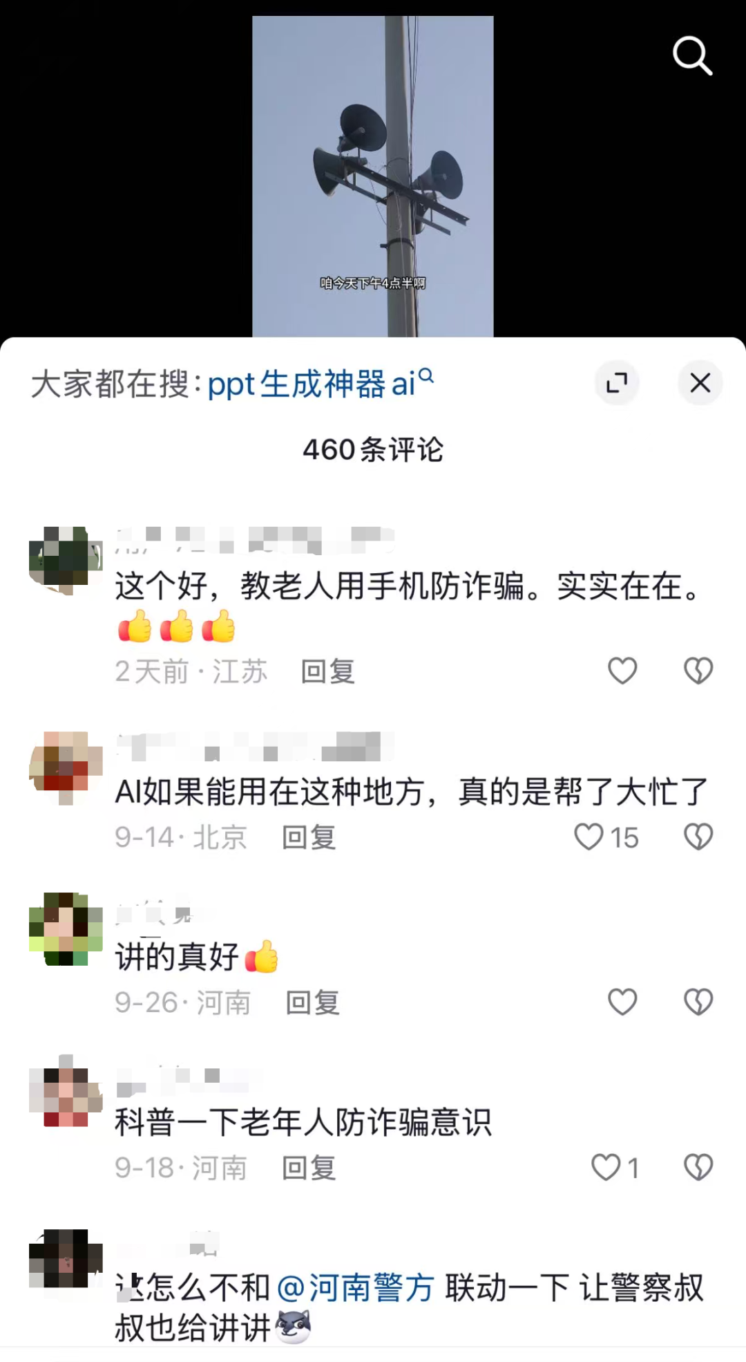 在社交平台上,在媒体报道中,在AI公司的官网上,AI渗透的场景五花八门。在得知村里一名月收入700块钱的环卫阿姨因为看短剧“稀里糊涂”被扣了400块钱, 河南鹤壁三家村95后“网红村官”张桂芳利用百度文库GenFlow,几分钟便做了一整套完整的手机反诈宣讲材料——除了PPT、宣传海报,GenFlow还贴心附上了一份专门针对老年人的防骗题库。