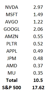 今年的情况就很好地说明了这一点。贡献最大的10档股票贡献了标普500指数约60%的涨幅(约占该指数17.6%总回报率的10.5个百分点)。该族群包括 $英伟达(NVDA)$ 、 $苹果(AAPL)$ 、 $微软(MSFT)$ 和 $谷歌A(GOOGL)$ 等传统巨头,也包括 $Palantir Technologies Inc.(PLTR)$ 、 $美国超微公司(AMD)$ 和 $美光科技(MU)$ 等排名后位的公司。