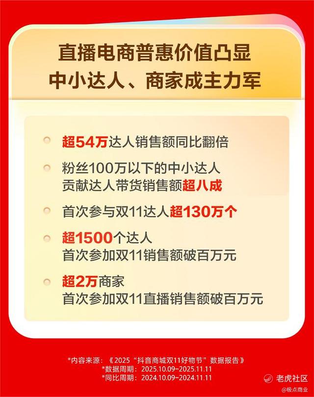 抖音电商2025年双11数据报告就显示,超过54万达人实现带货销售额同比翻倍,其中粉丝量在100万以下的中小达人贡献了达人带货总销售额超八成。同时,超130万名达人是首次参与大促,其中超过1500位销售额突破百万元。