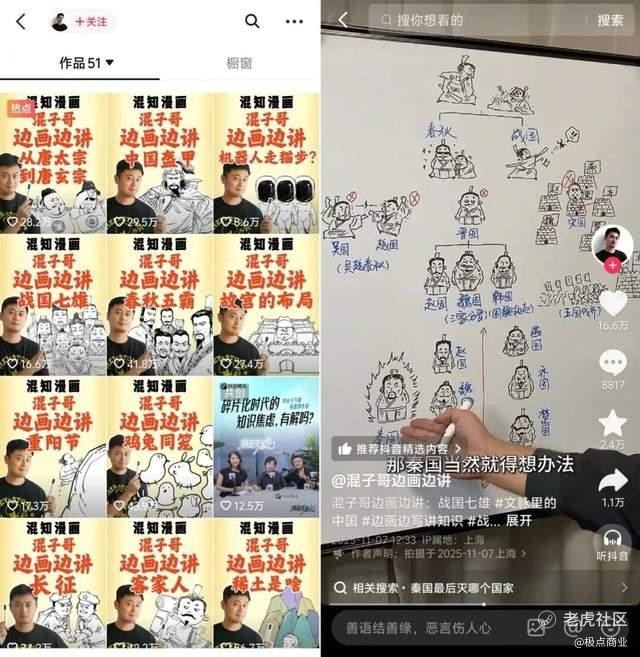 同样是在2025年双11,一千多公里外的上海。漫画式科普开创者,畅销书作家 @混子哥边画边讲 将白板搬进了直播间,一边画一边讲解各学科知识点,吸引众多网友关注。