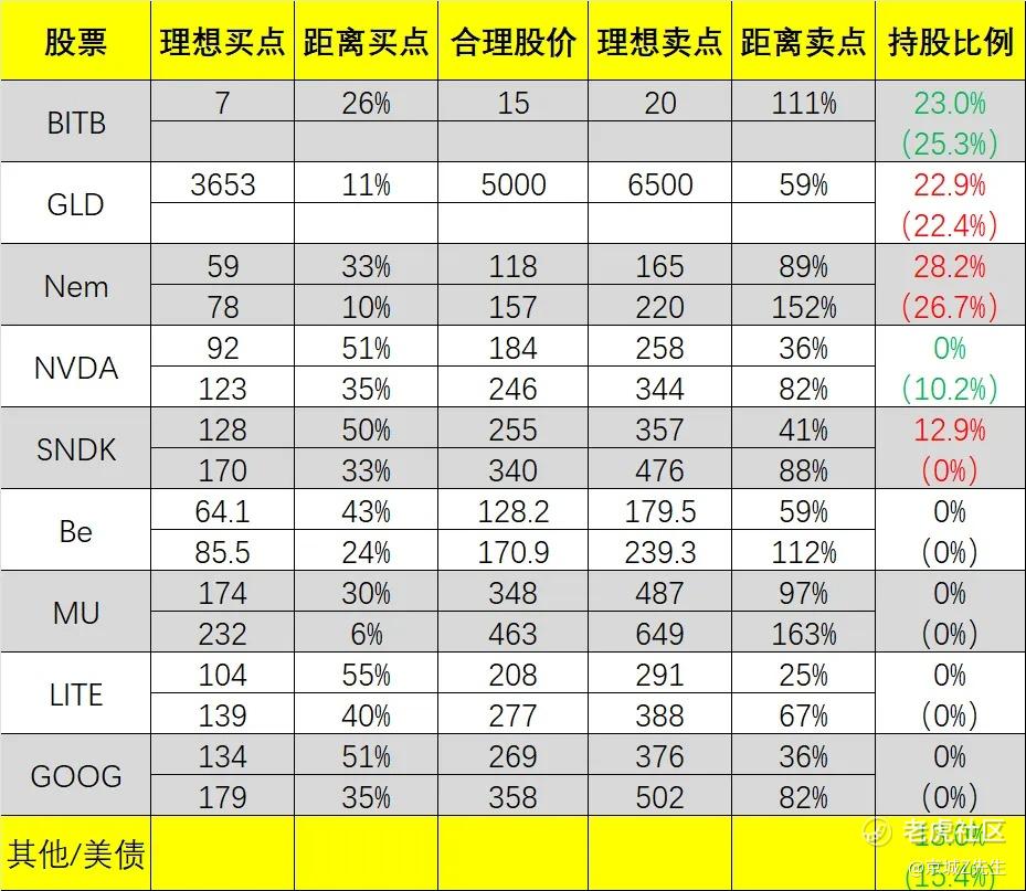 大饼ETF 23.0%,SNDK 12.9%,NEM 28.2%,GLD 22.9%,现金/美债 13.0%。