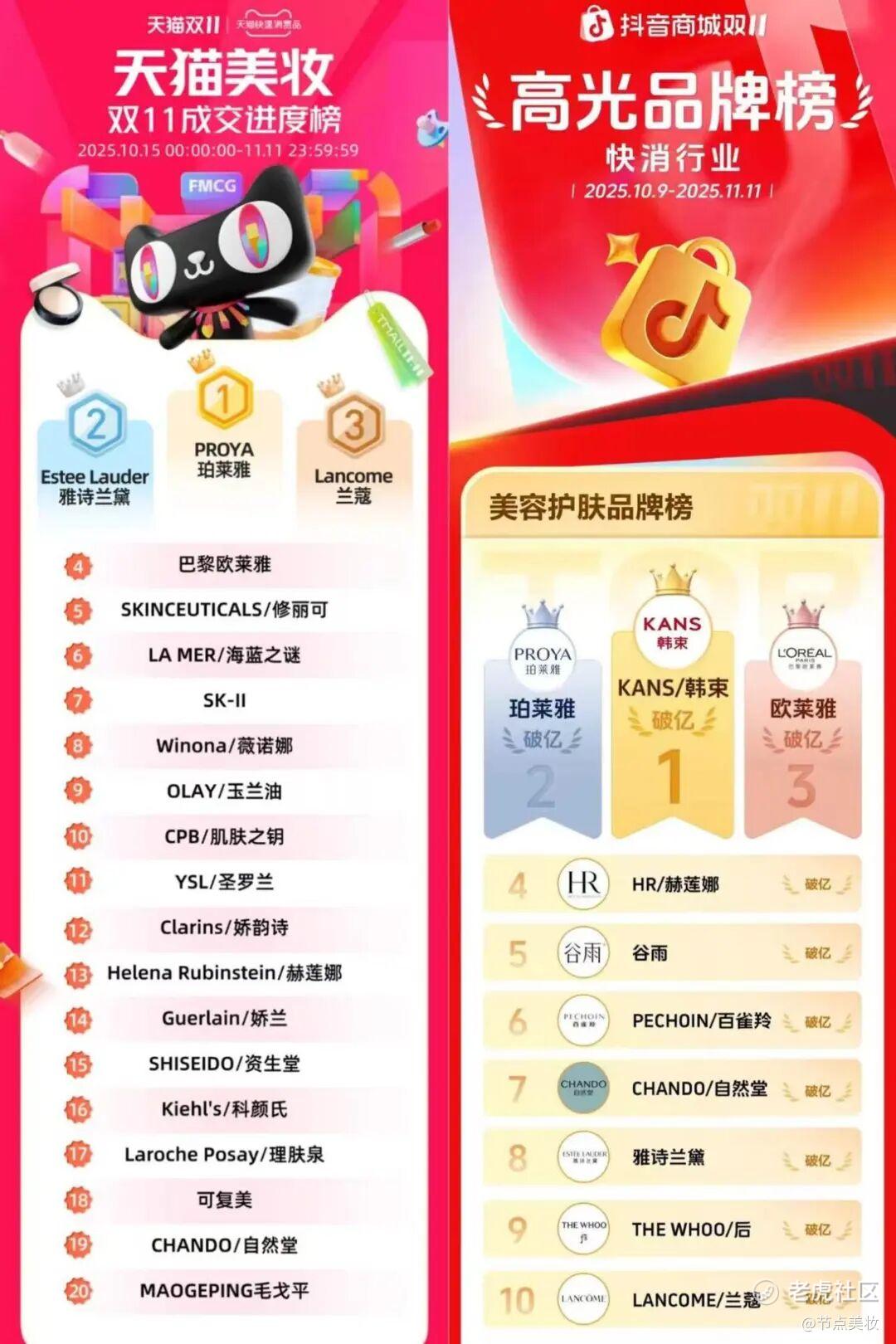 在流量驱动的新消费时代,资生堂的营销方式明显滞后。2025年双11美妆TOP10榜单中,资生堂旗下在抖音无一品牌上榜,天猫仅有CPB位列第十。