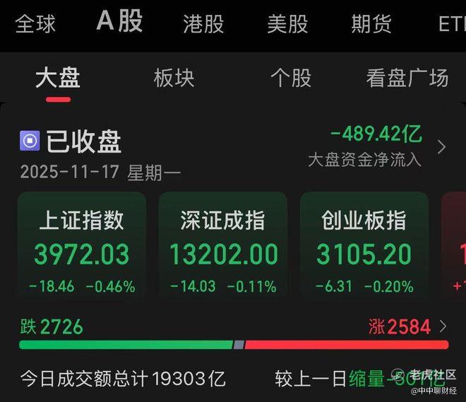 $上证指数(000001.SH)$ 今日股市大盘延续上周五的行情,三大指数集体收跌,上证指数下跌0.46%,深证成指微跌0.11%,创业板指回落0.20%,仅北证50逆势上涨0.81%。市场整体呈现缩量整理态势,沪深京三市全天成交额约1.93万亿元,较前一交易日减少逾500亿元。尽管指数表现偏弱,但个股涨多跌少,全市场超2500只个股上涨,显示出局部做多情绪依然活跃。