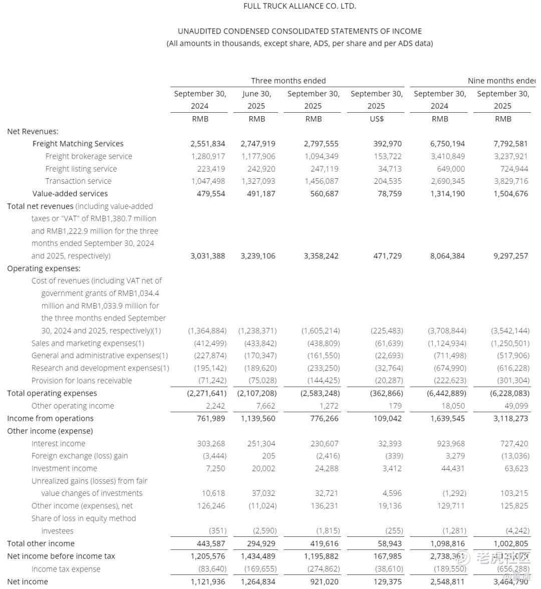 满帮2025年前9个月净利为34.65亿元(约4.87亿美元),较上年同期的25.49亿元增长35.9%。
