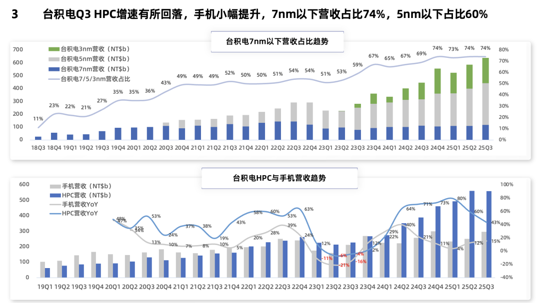 N2本季度试量产,良率表现良好,预期2026年快速爬坡,覆盖手机与HPC/AI需求;N2P预期2026H2量产;美国亚利桑那Fab加速导入更先进制程;
