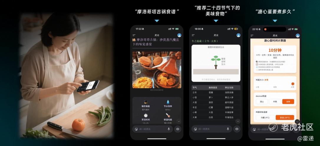 如用户咨询“溏心蛋要煮多久?”灵光可生成一个“溏心蛋时间计算器,用户根据实际情况自己选择“鸡蛋大小”“要求的熟度”等条件,自己调整出一个最符合自己情况的答案;用户想知道怎样养车最划算,灵光可以生成一个“养车成本计算器”,用户自由选择里程、油费等,组合出个性化的养车方案。