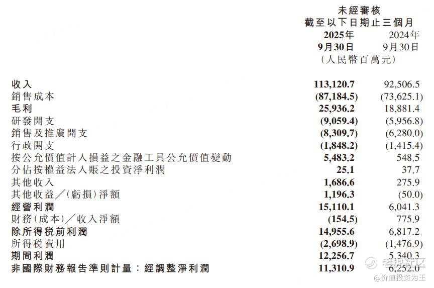 比如,三季度,小米来自公允价值计入损益之金融工具公允价值变动达到54.8亿,远高于去年同期的5.5亿,主要是今年股市大涨,小米的投资收益飙升,而去年三季度,国内股市惨不忍睹,公允价值带来的收益很低。