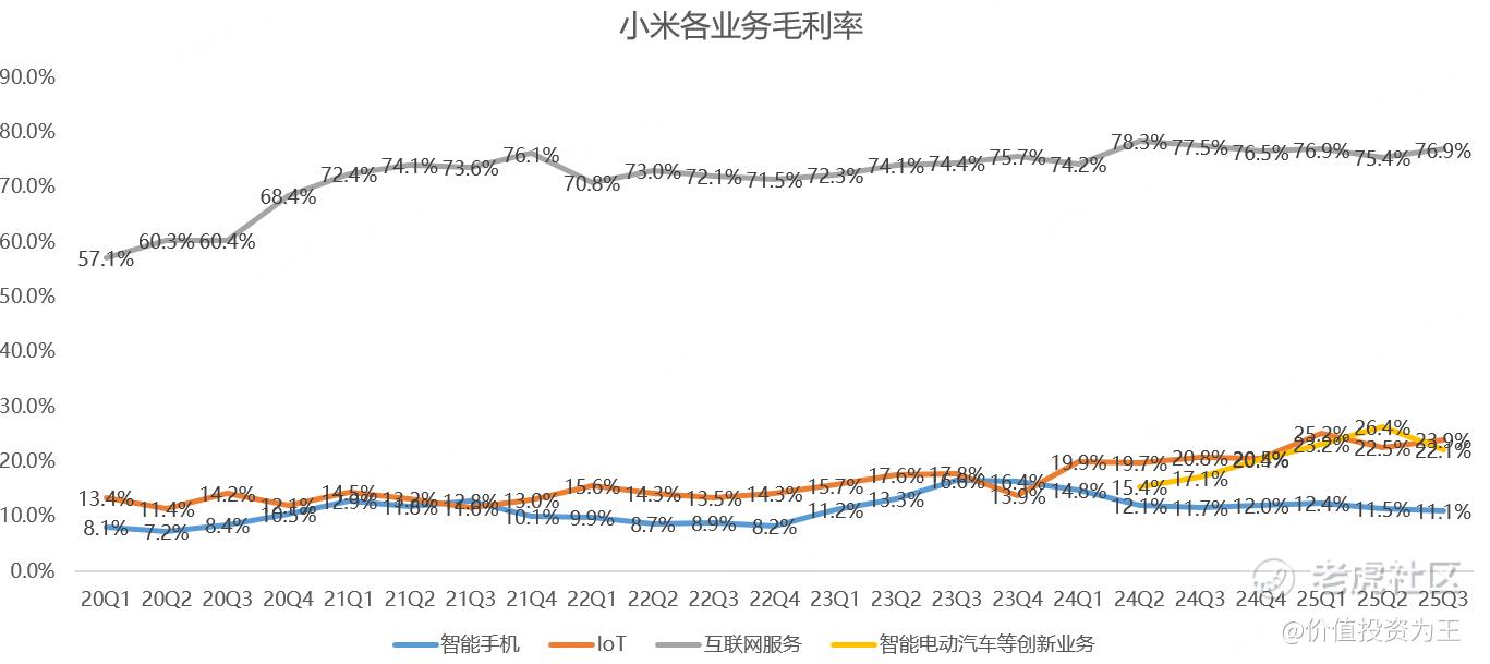 汽车业务高增主要是小米汽车销量带动,虽然超分析师预期,但三季度汽车业务毛利率为22.1%,低于二季度的26.4%: