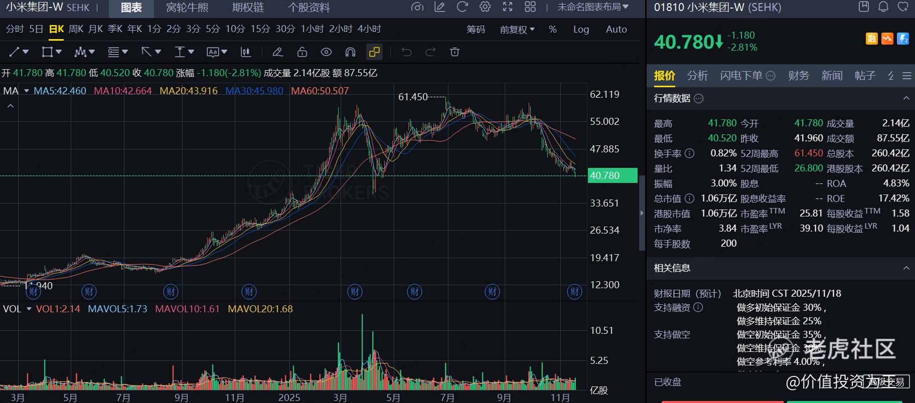 总结下来,小米三季报难言乐观,从股价上也能看出端倪,在今日发布财报前夕,股价创了阶段新低,在一众科技公司中,小米表现最差: $小米集团-W(01810)$