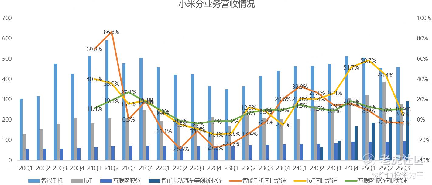 总的来说,小米当下的收入主要靠汽车业务拉动,手机和IoT表现不佳,互联网负责稳定。