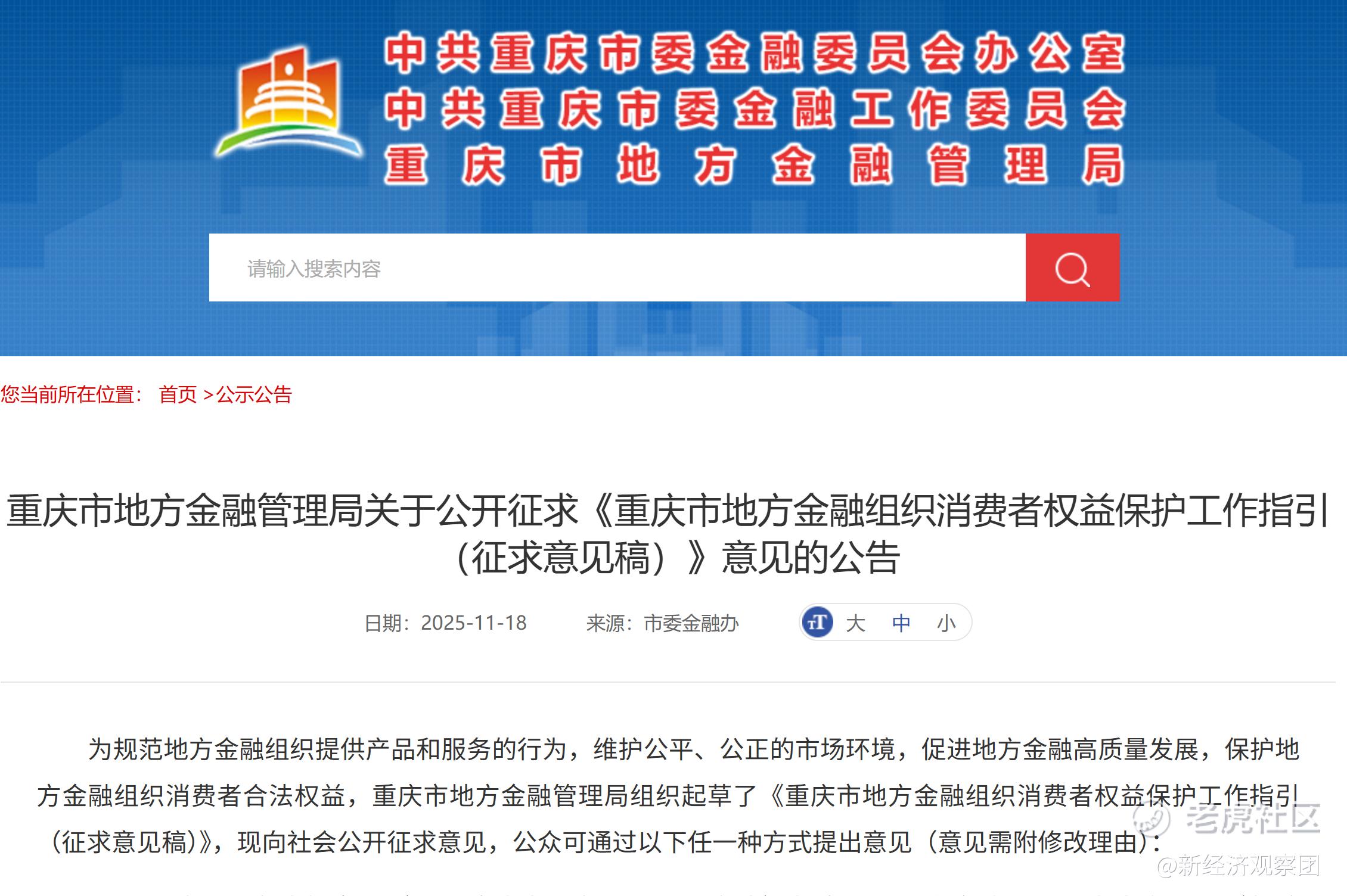 11月18日,重庆市金融监管局发布了《重庆市地方金融组织消费者权益保护工作指引(征求意见稿)》(以下简称《征求意见稿》)。据了解,这是地方金融组织首次发布的消费者权益保护工作指引。