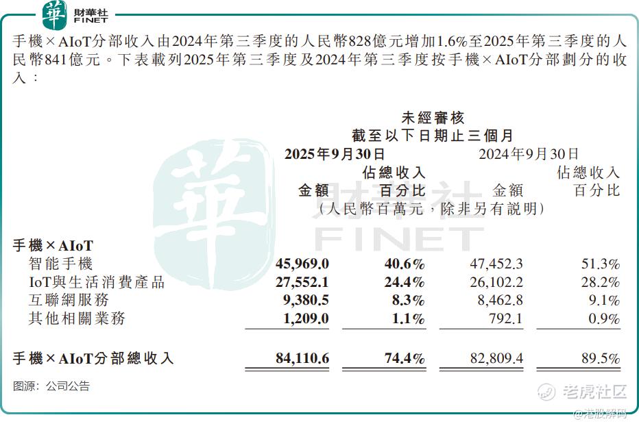 互联网服务业务表现突出,第三季度收入同比增长10.8%至93.81亿元,创历史新高,成为小米生态变现的核心支撑。