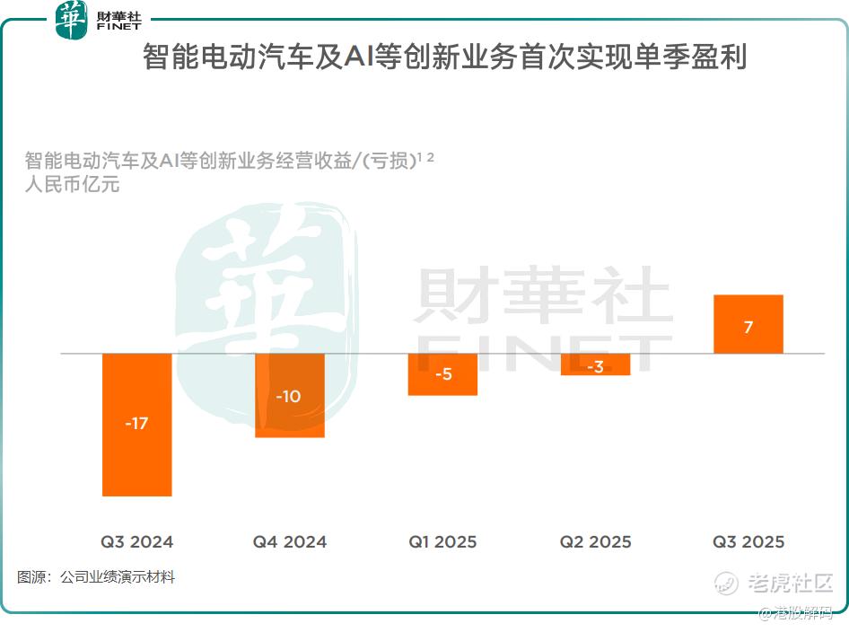 今年第三季度,智能电动汽车及AI等创新业务实现收入290.1亿元,同比增长199.2%。得益于规模效应显现,该业务毛利率达25.5%,同比大幅提升8.4个百分点,并首次实现单季度经营盈利,经营收益为7亿元。