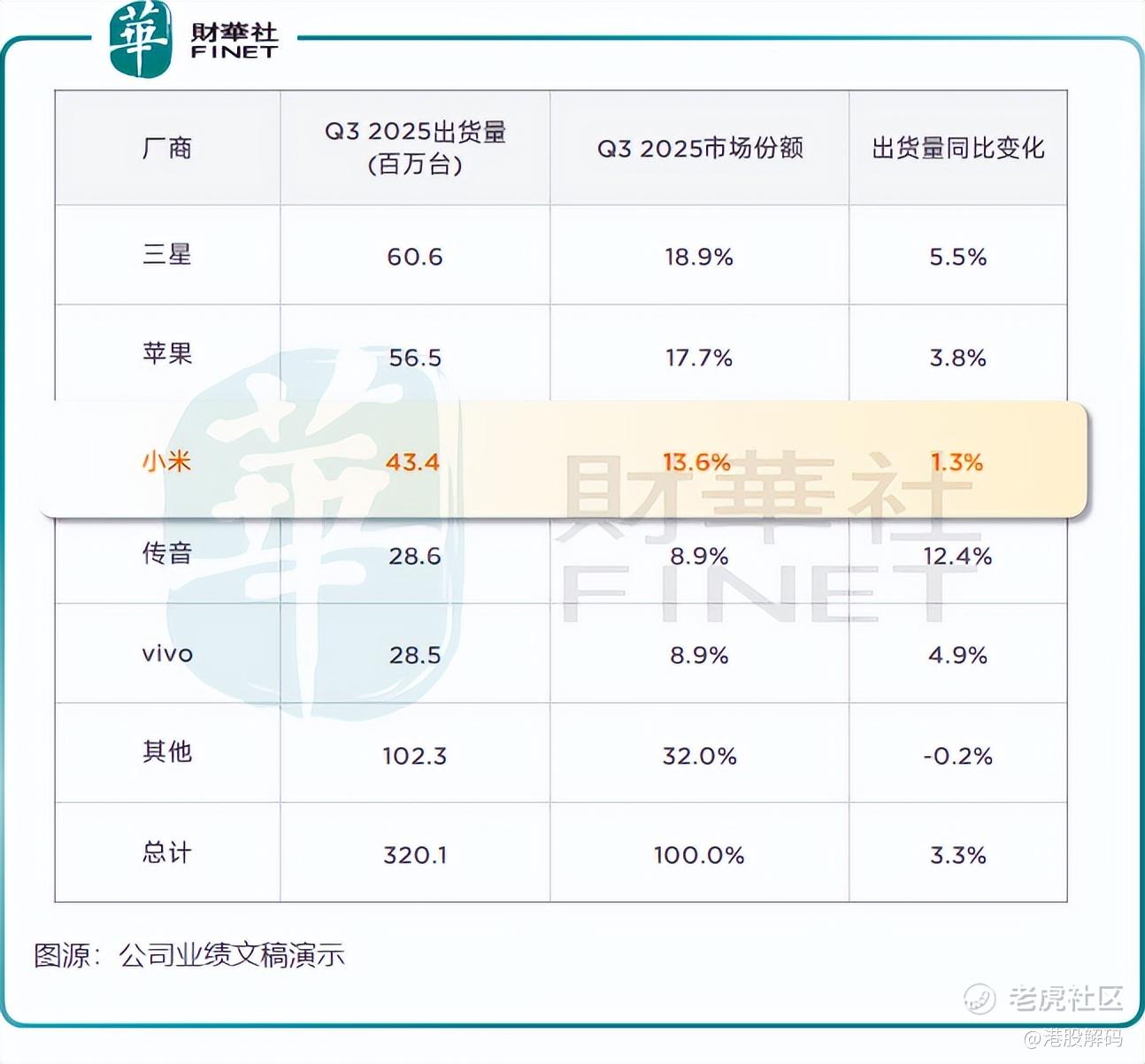 作为小米“现金奶牛”之一的智能手机业务,今年以来却持续承压。第三季度出货量4340万台,同比仅微增1.3%。在出货量前五的品牌中,小米增速最低,不及三星(5.5%)、苹果(3.8%)、传音(12.4%)和vivo(4.9%)。