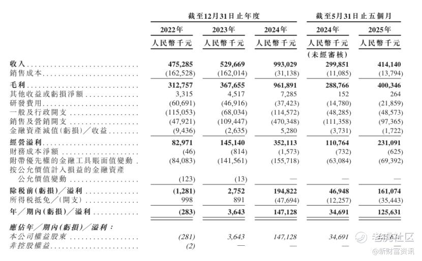 先看亮点:2022-2024年,收入从4.75亿飙升到9.93亿,年复合增长率44.55%;毛利更夸张,从3.13亿涨到9.62亿,复合增速75.37%,毛利率更是从65.8%冲到96.86%。2025年前五个月,收入4.14亿,净利润1.26亿,毛利率仍有96.67%,增长势头确实猛。