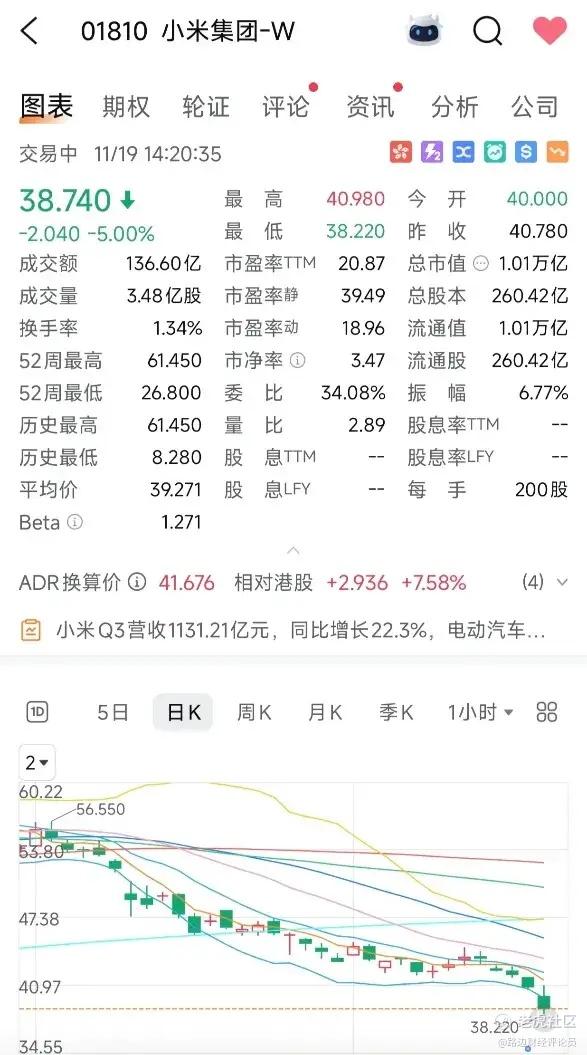2025年11月18日,小米集团披露的第三季度财报呈现出强烈的反差感:总营收1131.21亿元同比增长22.3%,经调整净利润113.11亿元同比激增81%,智能汽车业务更首次实现7亿元单季盈利。然而这份超预期的成绩单未能提振市场信心,财报发布次日小米股价跌破40港元后一路下探至38.22港元,较9月高点累计跌幅超30%,市值缩水至万亿港元关口徘徊,市盈率不足20。