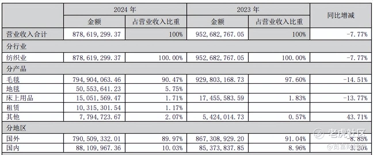 从业务层面来看,毛毯制造业务占据了公司约90%的营收比例,是绝对的主营业务。其次是地毯业务,占营收比也仅有5%左右,床上用品等业务占比则更少。与此同时,真爱美家近九成收入来自海外市场,凭借“世界超市”浙江义乌的地理优势,产品远销中东、北非和南非等地。