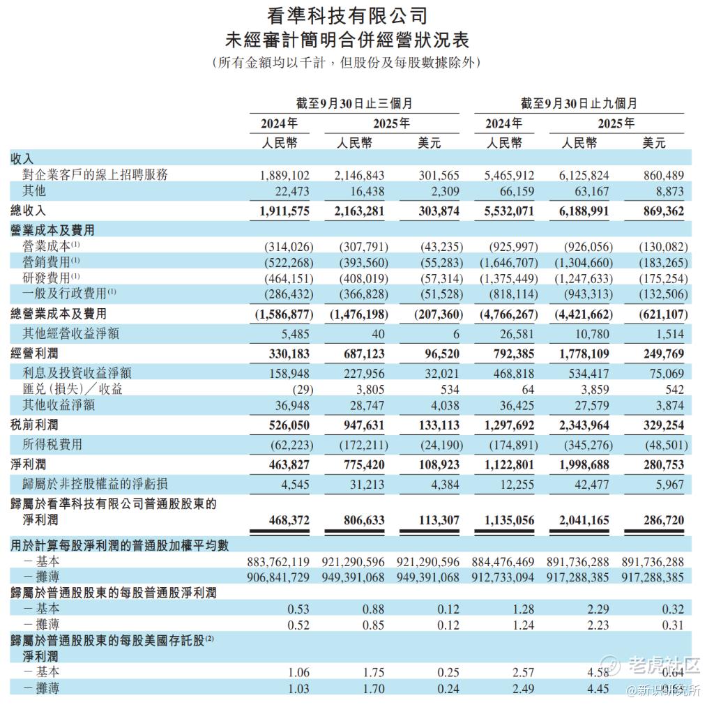 据华尔街见闻报道,11月11日,中国最大的在线招聘平台BOSS直聘(看准科技)发布2025年第三季度财报(未经审计)。数据显示,公司当期业绩实现营收与利润双增长,成本控制成效显著,核心业务与用户规模同步稳步扩张,整体发展势头强劲。