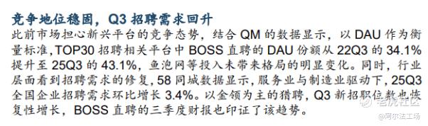 Q3财报发布后,华泰证券发布报告称,第三季度,BOSS直聘业务延续环比改善趋势,收入端增长有所提速。随着宏观经济目标逐渐确立,26 年宏观需求具有较强支撑,利润弹性较大,维持“买入”评级。