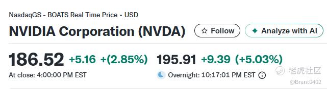 盘后,NVDA直接大涨5%,报收于195.91美元,强势扭转此前的情绪,也提振了半导体板块。