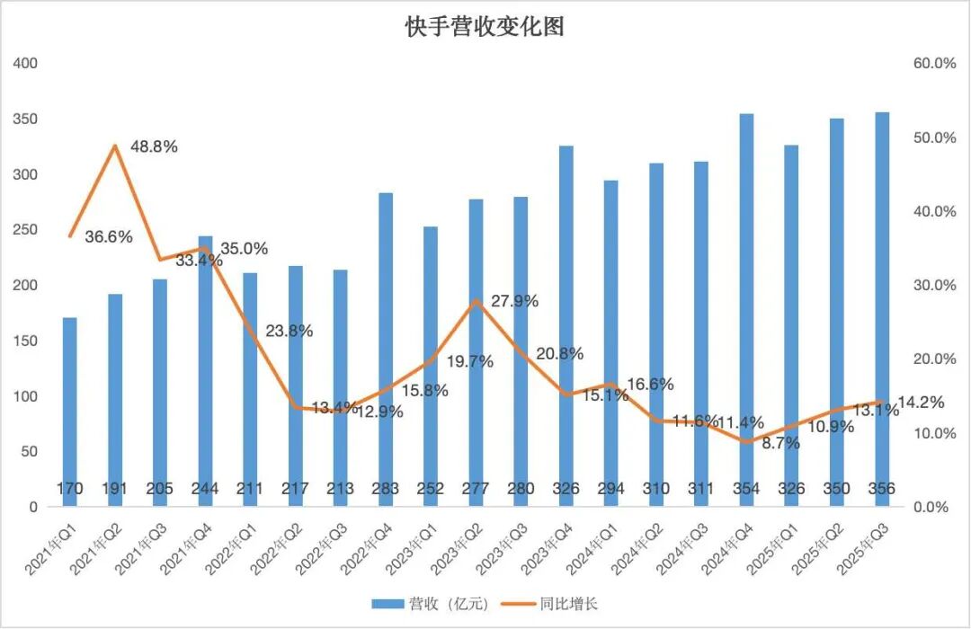 财报显示,第三季度,快手总营收同比增长14.2%,达到356亿元。这也是最近6个季度以来最好的同比增速。