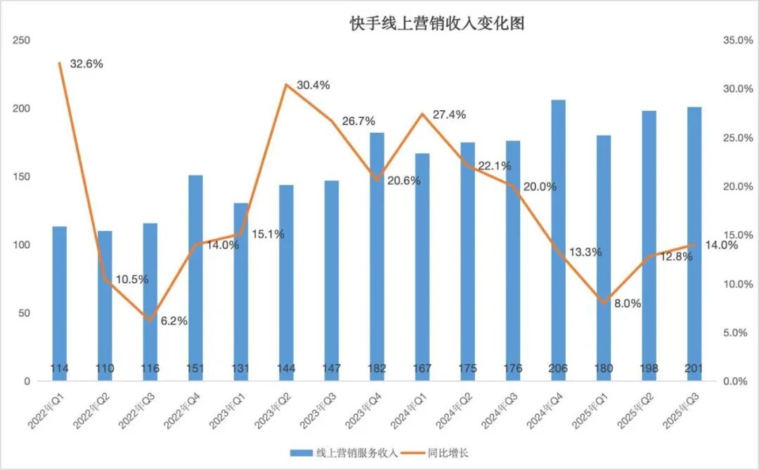 其中,收入占比超过一半的广告业务,是快手营收增长的主要拉动器。财报显示,快手的线上营销服务营收为201亿元,与2024年同期的176亿元相增长14%。快手称,该增长主要是由于借助AI技术持续升级线上营销投放产品。