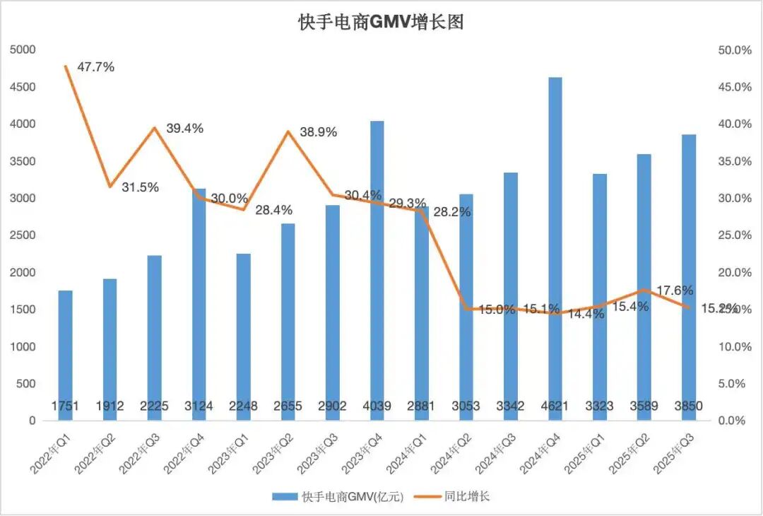 根据快手的披露,这一季度的电商GMV为3850亿元,同比增长15.2%。近一年多以来,快手的电商GMV增速一直保持20%以内的增速,这也反映了电商大环境竞争激烈。
