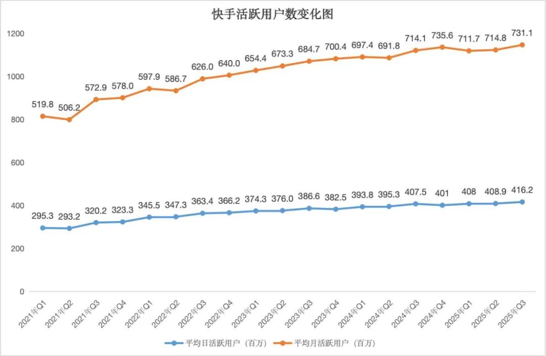 财报显示,第三季度,平均日活跃用户为4.162亿,而2024年同期为4.075亿,同比增长2.1%;平均月活跃用户为7.311亿,同比增2.4%。同时,快手披露,每位日活跃用户的日均使用时长达到134.1分钟,用户总使用时长同比增长3.6%。