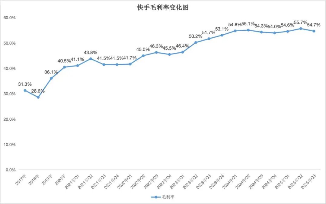 比如,第三季度,快手的销售及营销开支为104亿元,与2024年同期持平,远低于收入同比增速,其所占总收入比例下降了4个百分点。再比如,快手的行政开支为6.88亿元,同比减少了13.6%,该下滑主要是由于员工福利开支(包括相关以股份为基础的薪酬开支)减少。这可能是因为快手进行了裁员。