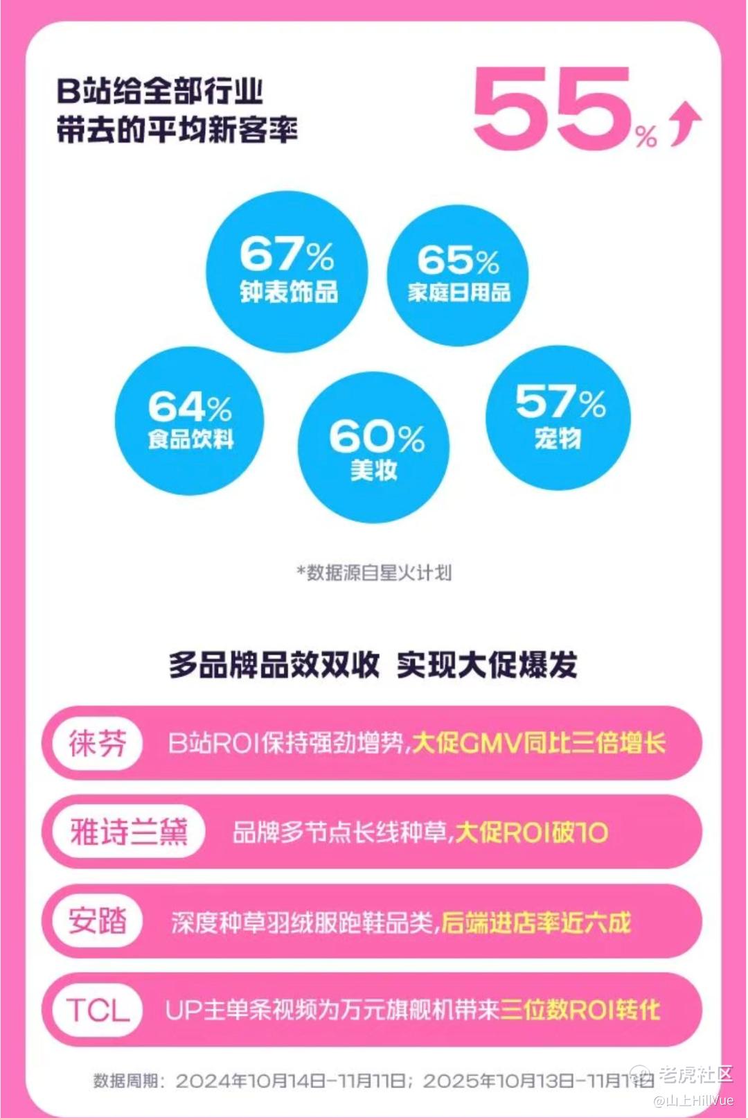 这样的案例还有很多。美妆品牌雅诗兰黛在双十一期间,通过头部+泛兴趣 UP 主集中种草,继而引爆销量,收获 ROI 10+的平均转化,新客率超 70%。安踏通过在 B 站深度种草羽绒服、跑鞋等品类,后端进店率近六成。