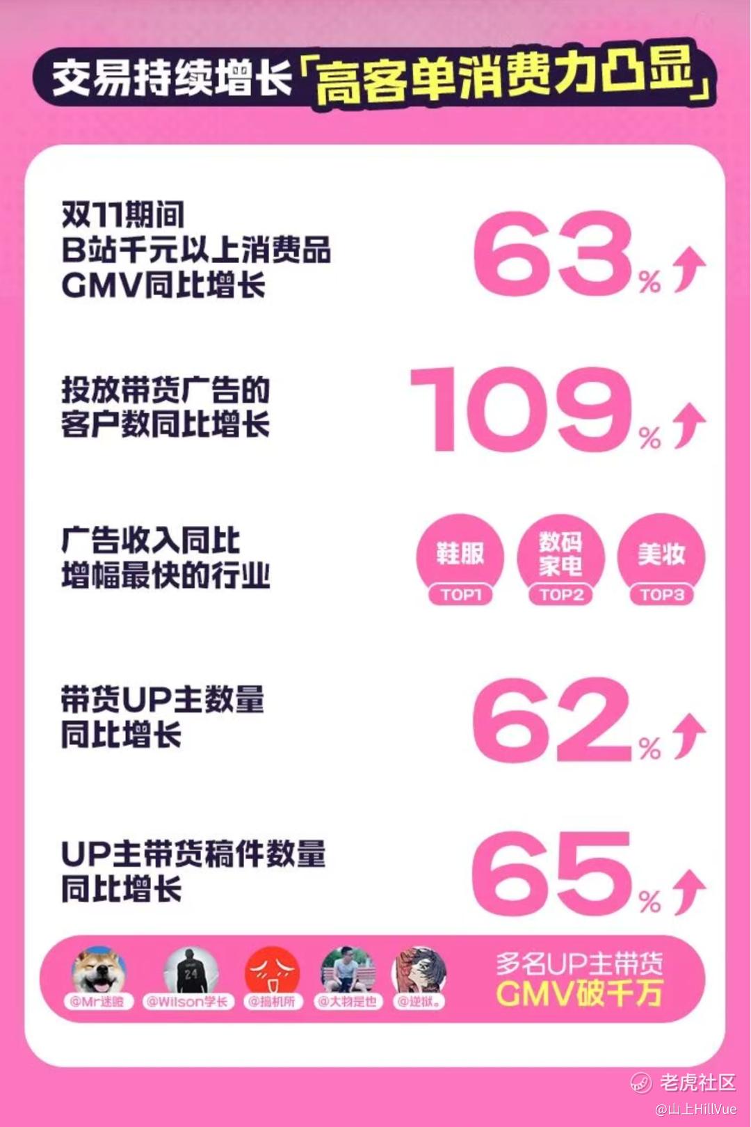 B 站的好内容正在被越来越多品牌方认可。根据 B 站对外披露数据,双十一期间在 B 站投放带货广告的客户数量较去年同期大幅增长 109%,千元以上消费品的 GMV 同比增长 63%。