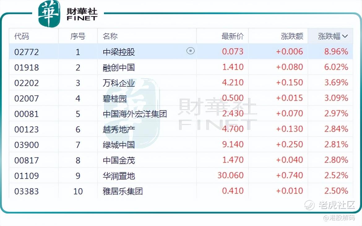 截至收盘, $融创中国(01918)$ 涨6.02%, $万科企业(02202)$ 涨3.69%, $碧桂园(02007)$ 涨3.09%,中国海外宏洋集团(00081.HK)涨2.97%,越秀地产(00123.HK)涨2.84%,绿城中国(03900.HK)涨2.81%,华润置地(01109.HK)、中国海外发展(00688.HK)等股均加入这波上涨浪潮。