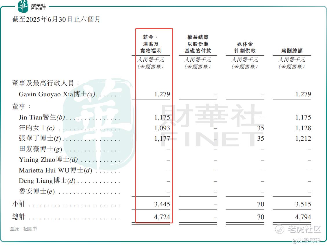 招股书披露,2023年、2024年及2025年上半年,联合创始人及董事兼首席执行官夏国尧获得薪金、津贴及实物福利分别为294.0万元、324.1万元、127.9万元;联合创始人及首席医学官田劲获得薪金、津贴及实物福利分别为227.4万元、301.3万元、117.5万元。