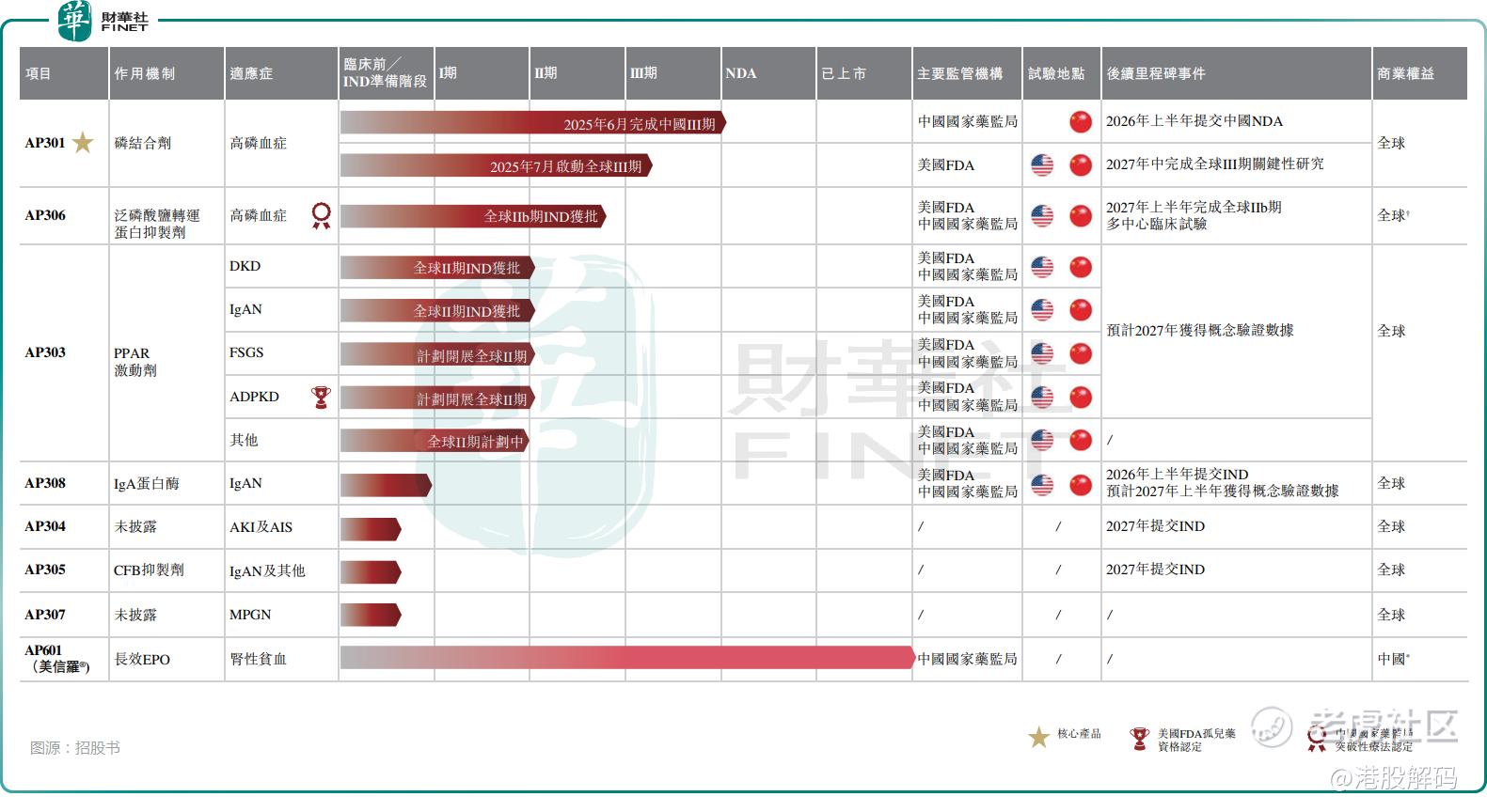 此外,候选产品AP306是一款用于治疗高磷血症的潜在FIC泛磷酸盐转运蛋白抑制剂,是全球首款且截至2025年10月27日临床开发中唯一一款用于治疗高磷血症的泛磷转运蛋白抑制剂,已获得中国国家药监局的突破性疗法认定(“BTD”)。