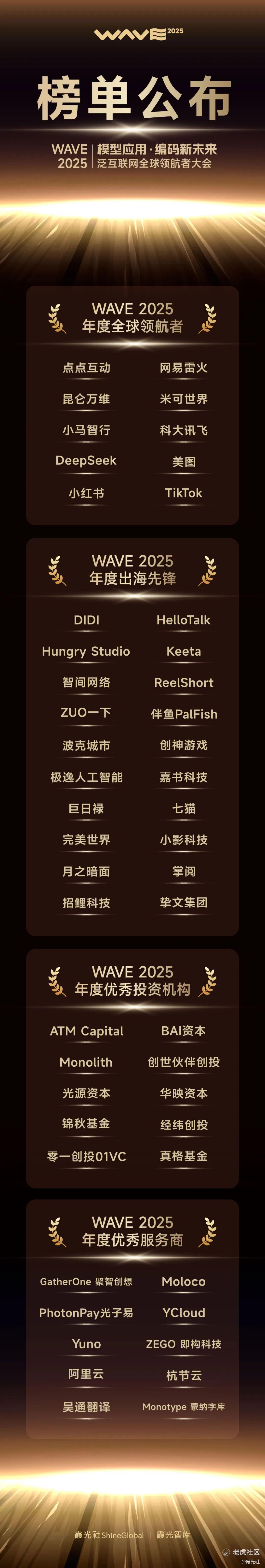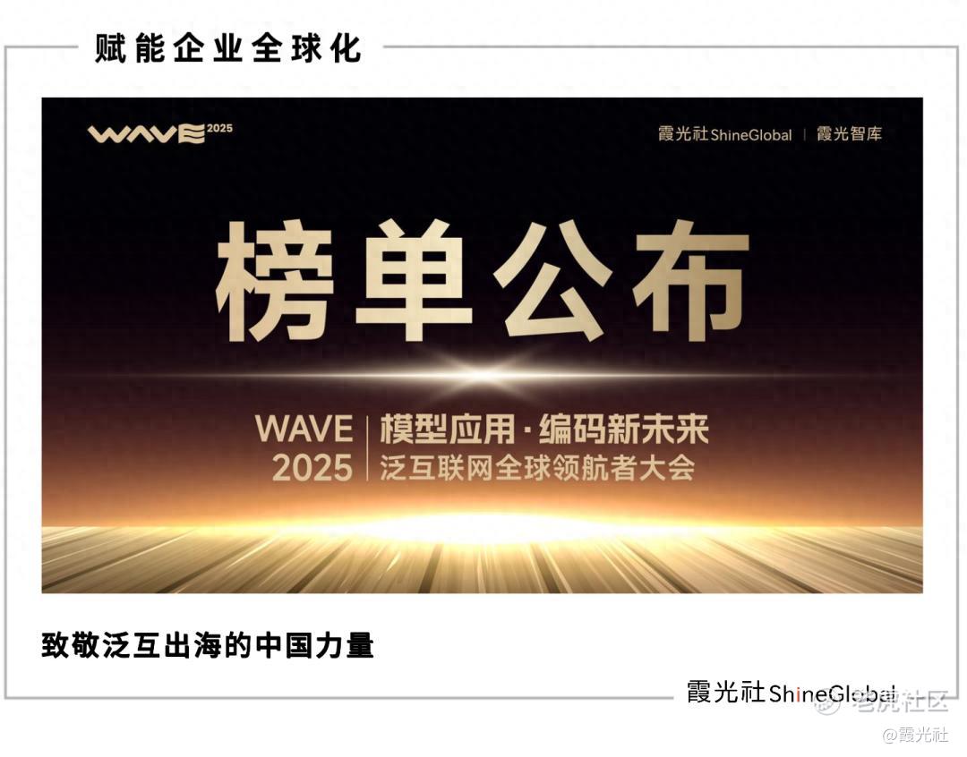 与此同时,一批出海企业已经敏锐地捕捉到趋势的变化,以领航者、先锋的姿态成为泛互联网出海的优秀代表。在此次大会上,霞光社&霞光智库联合第三方机构评选的「WAVE 2025 泛互联网全球领航者年度榜单」揭晓,共有50家知名出海企业/品牌、优秀投资机构、出海服务商入围。