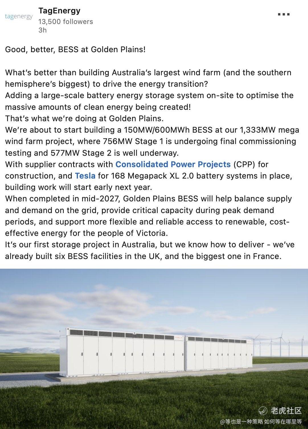 🔥🎯Tesla, Inc.(Tesla)获得一笔重大储能订单——来自 TagEnergy 的约 1.70 亿美元项目,用于在澳大利亚维多利亚州与南半球最大风场之一共建 150 MW/600 MWh 大型电池储能系统(BESS)。