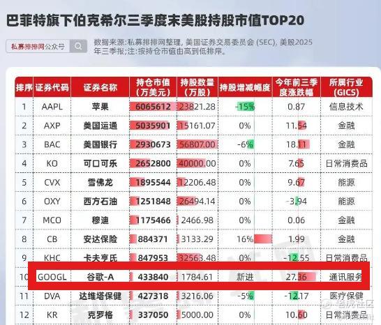 过去几十年坚决“不碰科技股”的全球股神巴菲特,三季度突然“改口”,旗下伯克希尔哈撒韦大手笔买入1784万股谷歌股票,持股市值达43.4亿美元,谷歌直接跃升为其第十大重仓股。
