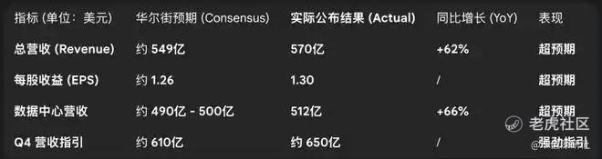 先看业绩。11月19日,英伟达公布的2026财年第三财季财报,用数据狠狠回击了“增长见顶”的说法。当季营收570.06亿美元,比去年同期涨了62%,超过市场预期的542亿美元,其中AI相关的数据中心业务同比狂涨66%!