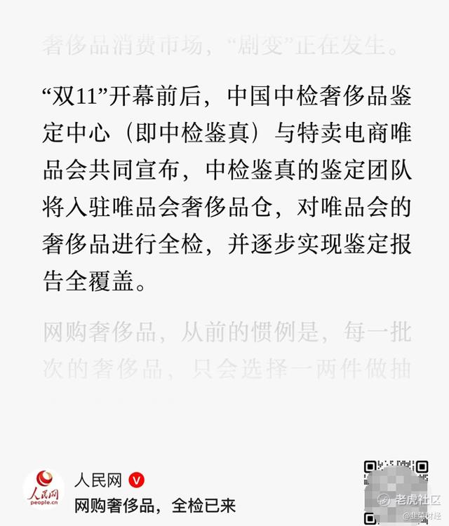 唯品会这一“线上奥莱”,也很有代表性。它如今同样成了不少年轻人心中买奢侈品的重要选项,从数据上看,今年1-9月奢侈品销量涨了30%。前不久这家特卖电商更是开创了行业先河,全面接入了中国中检正品管理库,中国中检奢侈品鉴定中心的鉴定团队直接入驻唯品会奢侈品仓,对奢侈品进行100%全检,并逐步实现鉴定报告全覆盖。