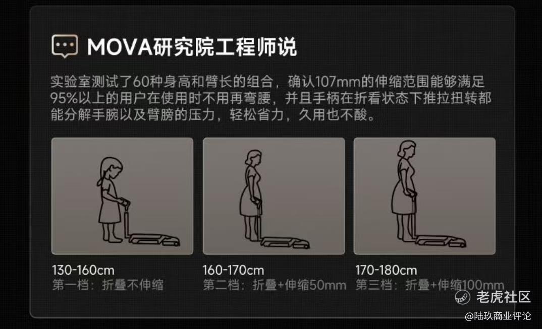在研发过程中,团队意识到仅靠折叠手柄仍难以适配不同身高的用户。因此,MOVA在手柄折叠的基础上加入了伸缩功能,通过测试120种身高与臂长组合,最终确定107mm的伸缩范围,可使95%以上的用户实现完全直立清洁。折叠状态下的手柄在推拉扭转时能有效分解手腕与臂膀的压力,实现久用不酸、轻松省力的体验。