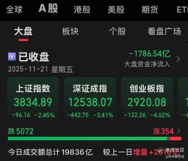 $上证指数(000001.SH)$ 11月21日,A股市场遭遇显著调整,三大指数集体重挫。其原因,可以归结为消息面,但我觉得更重要的是,涨幅过大,获利盘丰厚,只是外围或国内的这些消息面,加速了这个进程,大跌之前不是没有迹象,4000点来回徘徊,就已经是不详的预兆了,大盘连续小跌之后的大跌,震出了恐慌盘,然而,当前行情,下周的走势显得尤为重要,按说,或多或少会修复一下,否者,再想上4000点,就没那么容易了。下面我们来看一下今天的盘面走势。