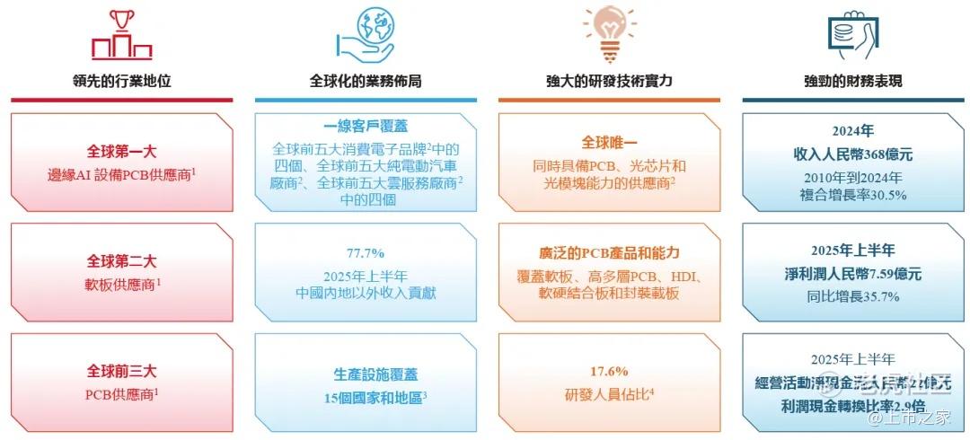 招股书显示,东山精密成立于1998年,专注于智能制造领域,核心业务涵盖PCB、精密组件、触控面板及液晶显示模块、光模块四大板块。根据灼识咨询数据,以2024年收入计,公司是全球第一大边缘AI设备PCB供应商、全球第二大软板供应商及全球前三大PCB供应商,同时也是全球唯一同时具备PCB、光芯片和光模块能力的厂商,相关产品在AI服务器物料成本占比达9%至14%。