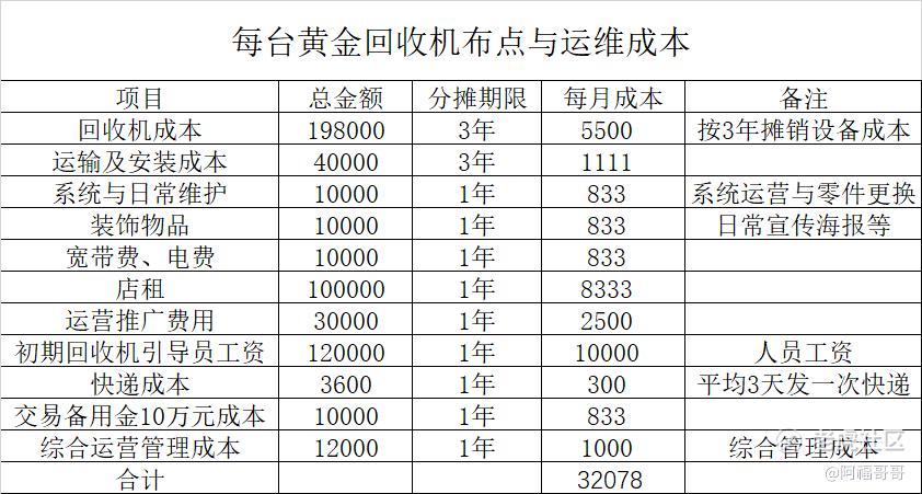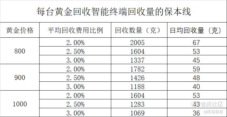 乐观情况,黄金价格在1000元及以上,全部按3%回收费用回收,则每月每台最低回收1069克(日均36克以上)即可保本;
