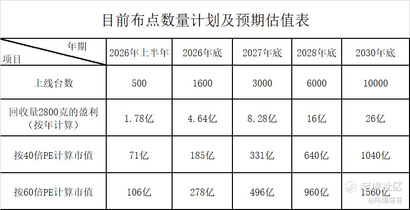 按照当前的市场布点规划,公司计划在2026年上半年至少计划铺出500台回收机,到2026年底不低于1600台,2027年底将至少铺到3000台,2028年铺到6000台,5年内累计铺设不低于10000台。若此规划能够落地,我们则能较好的计算出该公司每年的市场估值。